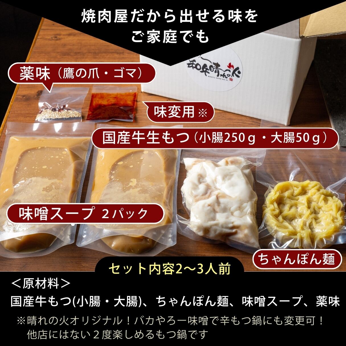 焼肉屋さんだからできる和牛だし100%当店オリジナル「もつ鍋」セット〆のちゃんぽん付き。美味しく召し上がって頂くために以下の説明を参考にお作りください【セット内容】①もつ鍋具材(国産牛生もつ+もつ鍋用スープ+〆用スープ)②薬味(鷹のつめ、胡麻)③〆のちゃんぽん 【ご準備いただくもの(基本的な具材)】(2人前参考例)①キャベツ2/4~半玉②ニラ1~2束(お好みで)ごぼう(ささがき)1~2本豆腐1丁(絹ごし)【作り方】①野菜を切る・キャベツは縦横5cm程度でカット・にらは約10cm程度でカット・ごぼうはささがきにし、暫く水につけておく②もつなべ具材を全て鍋に入れます③豆腐は適当な大きさに切って、鍋に入れます④ごぼう、キャベツ、にらの順で鍋に入れていきます⑤鍋に火をつけスープが「グツグツ」なってきたら7~8分煮込みます※POINT もつの色が白→半透明で「ぷるん」となってきたら食べ頃です⑥コンロの火を弱くし、お好みで薬味を入れてお召し上がりください⑦ちゃんぽん麺を残ったスープに入れて2~3分煮込んでお召し上がりください。※POINT スープの味が濃くなっているようでしたら、お湯を足して味を調節してください⑧ちゃんぽん麺まで食べておなかいっぱいじゃない場合は雑炊もオススメです。生ものです。商品到着後は必ず冷蔵保存を行い2~3日中にお召し上がりください※冷凍の場合は2週間程度保存可能です